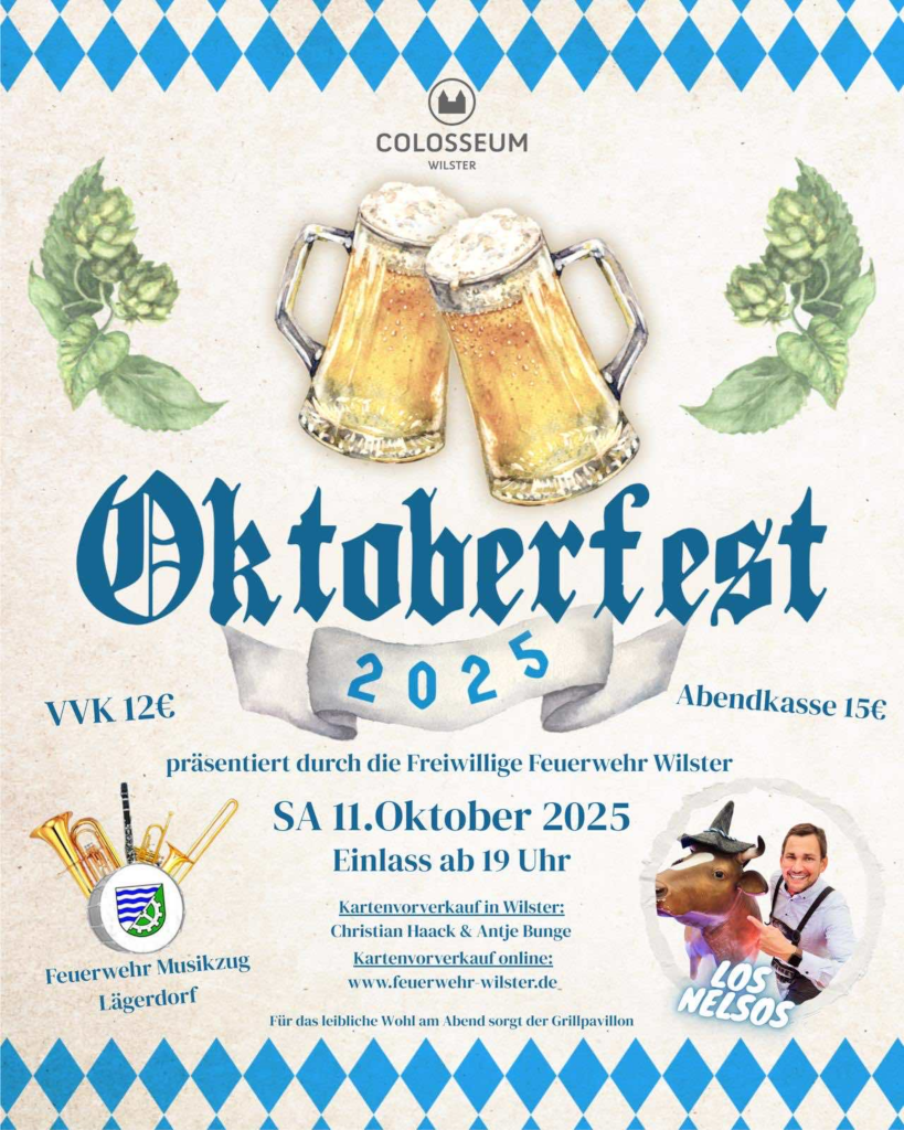 Bald ist es wieder soweit! Am 11. Oktober 2025 könnt Ihr Euch wieder in Eure Tracht und Eure Lederhosen werfen, um gemeinsam mit uns eine Riesengaudi auf dem Oktoberfest der Feuerwehr Wilster im Colosseum zu feiern. Mit dem besten Feuerwehrmusikzug aus Schleswig-Holstein, dem Feuerwehrmusikzug Lägerdorf und DJ Los Nelsos bieten wir wieder Stimmung und Athmosphäre für Jung und Alt.