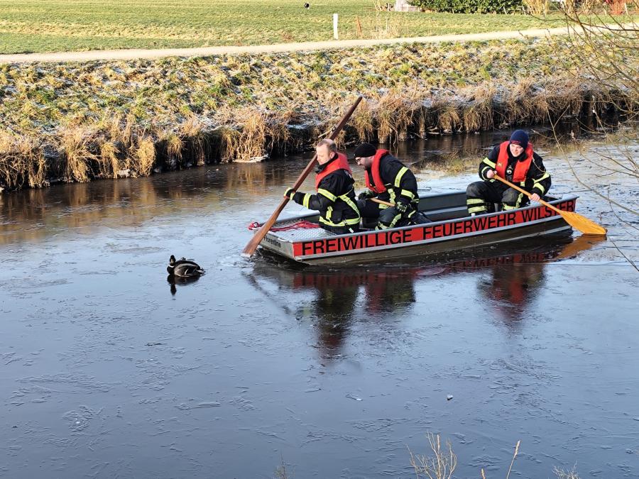 Mit einem Gruppenalarm wurde die Feuerwehr Wilster zu einer auf der Wilster-Au festgefrorenen Ente gerufen.
