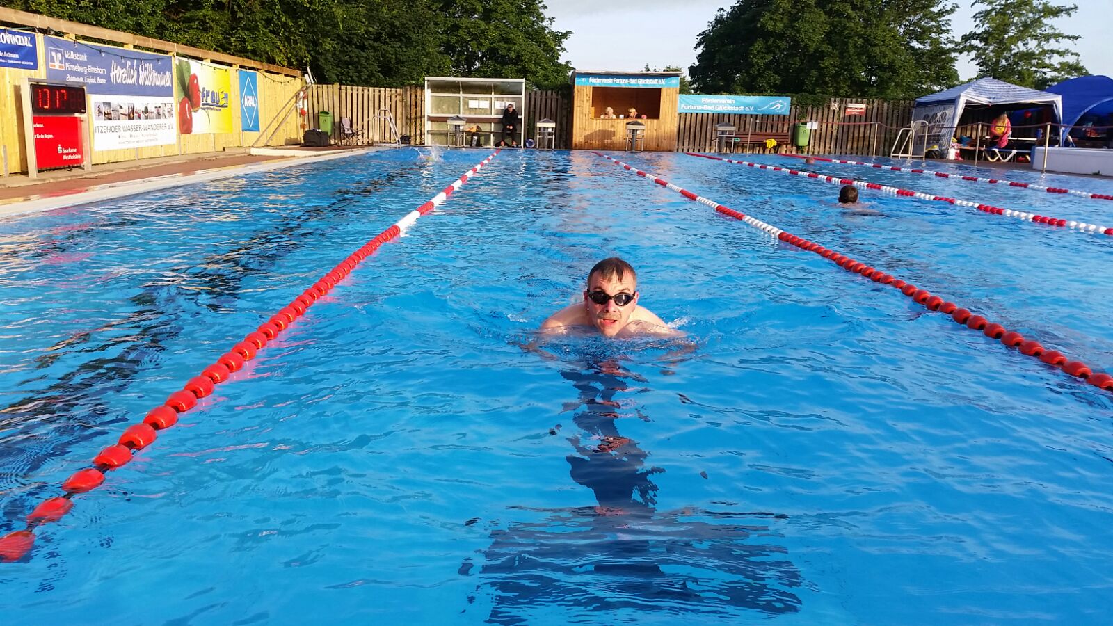 Andree Steege von der Feuerwehr Wilster ist seit der ersten Stunde dabei. Zunächst gemeinsam mit Arbeitskollegen, im Jahr darauf mit einer gemischten Mannschaft der Feuerwehren Wilster und Brokdorf. In diesem Jahr waren es überwiegend Feuerwehrkameraden aus Wilster sowie Bekannte und Freunde, die Spaß am Schwimmen und der guten Sache haben. Für jeden geschwommenen Kilometer spenden Sponsoren einen Betrag. Die Feuerwehr Wilster wurde dabei erneut vom Möbelhaus Wolfsteller unterstützt, und das nicht nur als Sponsor, sondern auch sportlich. Firmenchef Peter Wolfsteller ließ es sich nicht nehmen und war Startschwimmer der Wilsteraner Staffel.