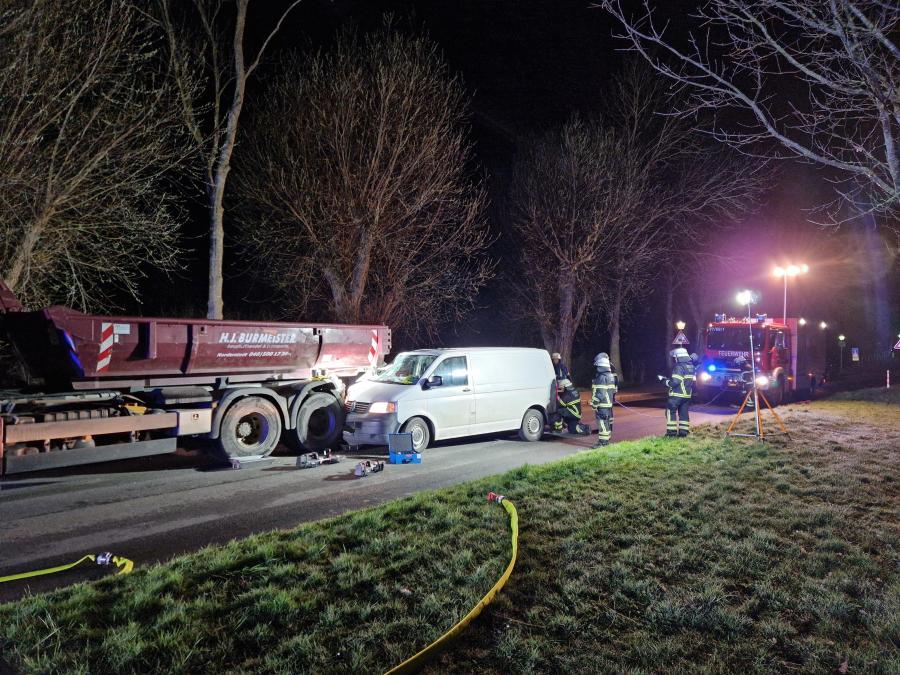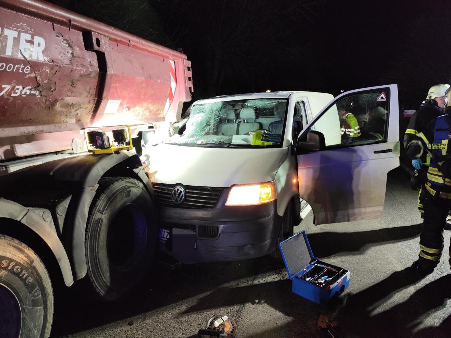 Dort ist ein VW Transporter in einen am abgestellten Abrollkipper mit Mulde kollidiert. Da es anfänglich hieß, das der Fahrer eingeklemmt ist, wurden die Feuerwehren entspechend zur Technischen Hilfe alarmiert. Vor Ort stellte sich jedoch heraus, das der Fahrer zwar verletzt , aber nicht eingeklemmt war. Somit beschränkten sich die Tätigkeiten auf die Unterstützung des Rettungsdienst bei der Befreiung mittels Spineboard, das Ausleuchten der Einsatzstelle, Abstreuen und Aufnehmen von Betriebstoffen sowie das Beseitigen des Unfallfahrzeugs von der Fahrbahn.
