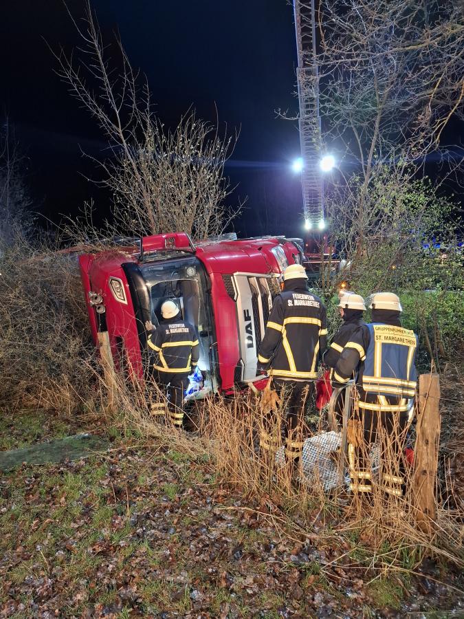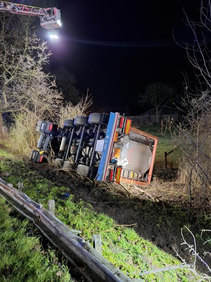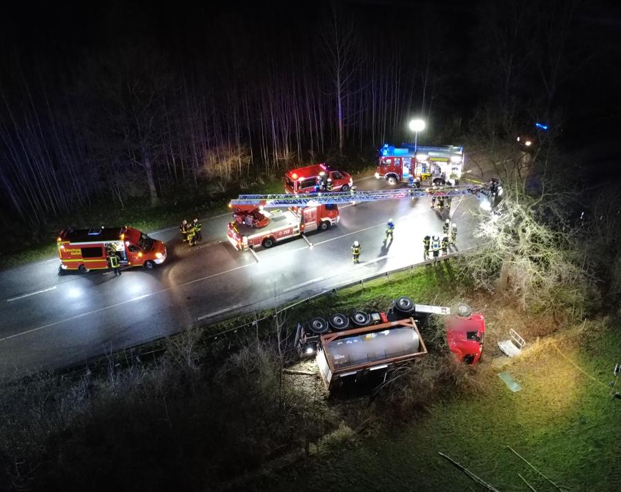 Als die ersten Einsatzkräfte an der Unfallstelle eintrafen, fanden sie einen im Graben auf der Seite liegenden Tanklastwagen vor. Nach einer ersten Einschätzung des Gefahrguts und der daraus folgenden Entwarnung für die Einsatzkräfte konnte der LKW ohne weitere Schutzausrüstung genauer erkundet und der Zustand des Fahrers festgestellt werden. Der Fahrer war glücklicherweise nicht schwer verletzt und musste lediglich aus dem Fahrerhaus befreit werden. Dies war nur über die Frontscheibe möglich. Vorsorglich wurde er dem Rettungsdienst zur weiteren Kontrolle übergeben.