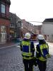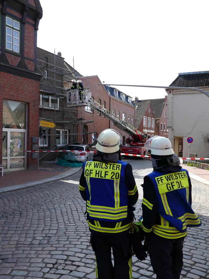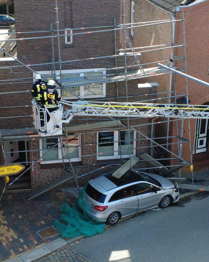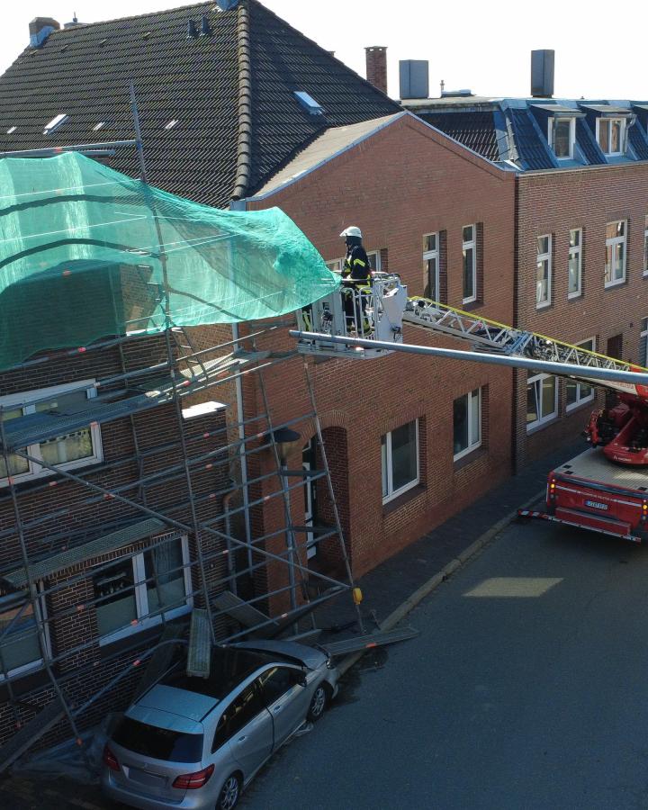 Aufgrund der Beschädigung und Instabilität des Baugerüstes bestand die Gefahr eines unkontrollierten Einsturzes. Daher wurde das Gerüst unter Einsatz der Drehleiter systematisch von oben nach unten zurückgebaut, um die Gefahrenstelle zu sichern.