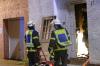 Unglücklicherweise war der Brand jedoch schon so weit fortgeschritten, daß das Feuer in die Zwischendecke zum ersten Obergeschoß gezogen war und dort den Fußboden in Brand gesetzt hatte. Dies zog über zweistündige Nachlöscharbeiten nach sich, weil der Fußboden im Obergeschoß aufwendig unter Atemschutz mit Motorsäge und Werkzeug geöffnet werden mußte, um alle Glutnester zu finden und abzulöschen.