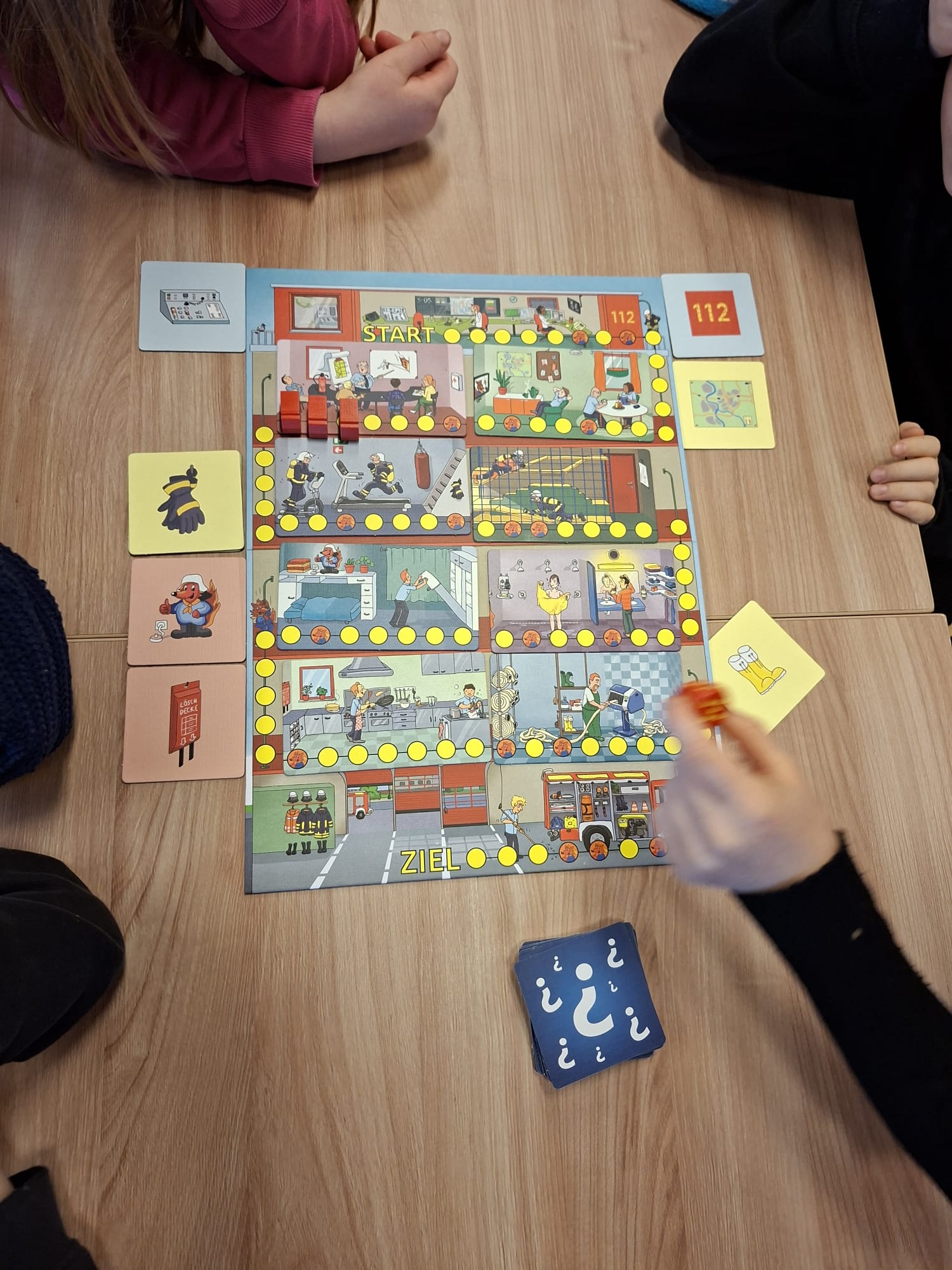 Im Anschluss erfolgte die Aufteilung in zwei Gruppen. In Form von Brettspielen wurden Teamfähigkeit und soziale Kompetenzen gefördert. Zudem wurden den Kindern spielerisch wichtige Grundlagen vermittelt, insbesondere die Bedeutung von Heimrauchmeldern, Rettungswegkennzeichnungen sowie weiterer Sicherheitseinrichtungen.