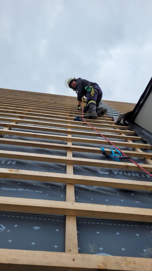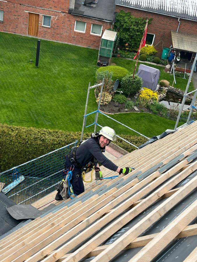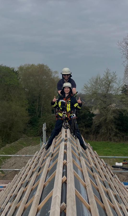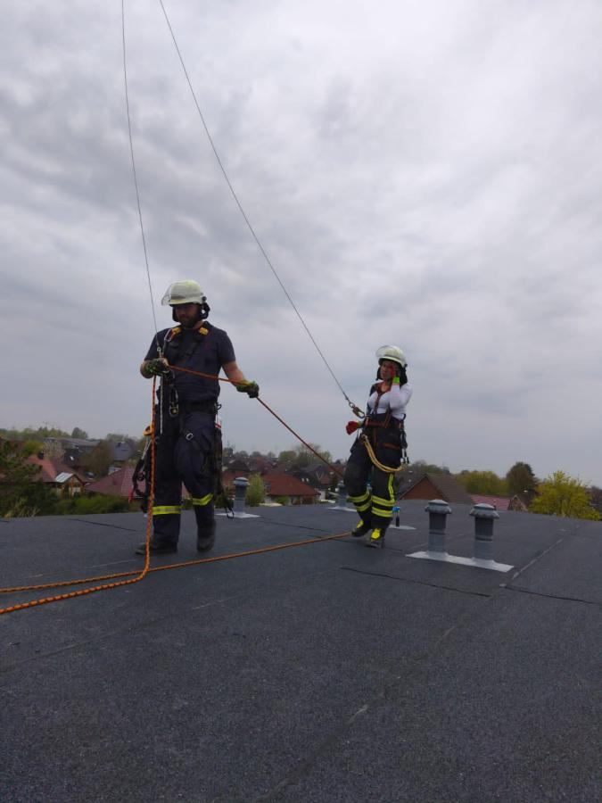 Neben dem Vorstieg am Baukran wurde auch die Rettung einer Person von einem Dach geübt. Hierzu ging eine Einsatzkraft mit einem Vorstiegshaken zur Sicherung der Person vor. Anschließend konnte diese mittels Seilsicherung vom Dach gerettet werden.