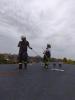 Eine weitere Übung gestaltete sich etwas umfangreicher: Auf einem Flachdach galt es, eine verunfallte Person schonend zu retten. Zwei Einsatzkräfte wurden mittels Drehleiter auf das Dach gebracht, um die Person zu betreuen und gleichzeitig eine Sicherung an vorhandenen Sekuranten (Einzelanschlagpunkten auf dem Dach) mittels Leine aufzubauen. Abschließend wurde die verunfallte Person mittels Schleifkorbtrage vom Dach gerettet.