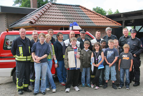 Kameraden der Feuerwehr Wilster unterstützten eine Aktion der Polizei-Zentralstation-Wilster, die im Rahmen einer Projektwoche an der Wolfgang-Ratke-Schule durchgeführt wurde. Sieben Schülerinnen und Schülern der Grundschule nahmen an dem Projekt „Polizei“ teil und bekamen einen Einblick in den täglichen Arbeitstag eines Polizeibeamten. Dabei lernten sie nicht nur, wie man Fingerabdrücke nimmt oder einen Steckbrief anfertigt, sondern auch welche Angaben bei der Abgabe eines Notrufes gemacht werden müssen und wie man sich an einer Unfallstelle zu verhalten hat. Hierzu hatte die Polizei in Zusammenarbeit mit dem Jugendrotkreuz, dem Rettungsdienst und der Feuerwehr ein Unfallszenario mit zwei verunfallten Radfahrerinnen nachgestellt. Täuschend echt geschminkt lagen die beiden Mädchen auf einem Gehweg, als sich die Projektgruppe, (für die Kinder völlig unerwartet), der Unfallstelle nährte. Waren die Kinder im ersten Moment etwas erschrocken, wussten sie jedoch sehr schnell, was zu tun war. Eines der Kinder setzte einen Notruf ab und nur wenige Augenblicke Später rückte die Feuerwehr mit zwei Einsatzfahrzeugen zur Unfallstelle aus. Der Rettungsdienst und die Polizei folgten und so wirkte alles wie ein realer Unfall. Nach einer kurzen Befragung durch einen Polizeibeamten zum Unfallhergang und Ähnlichen, wurden die Mädchen und Jungen in die Arbeit des Rettungsdienstes mit eingebunden. Am „Vorstelltag“ erfolgte mit zahlreichen Fotos und lebhaften Erzählungen die Präsentation des Projekts. .jpg)